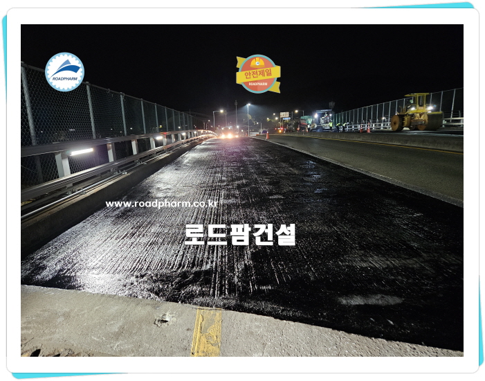 또한 교면방수는 상부 포장층과의 연계성을 고려하지 않으면 안 됩니다. 방수층과 아스팔트 포장층 간의 접착력이 부족할 경우, 차량 주행 중 전단력에 의해 밀림이나 박리 현상이 발생할 수 있으며, 이는 곧 조기 보수로 이어지게 됩니다. 이러한 문제를 예방하기 위해 최근 교면방수 공법들은 접착 성능을 강화한 재료 개발과 함께, 실제 교통 조건을 반영한 시험을 통해 신뢰성을 확보하고 있습니다. 교면방수는 단독 공정이 아닌 교량 상부 구조 시스템의 중요한 구성 요소로 인식되어야 하는 이유가 여기에 있습니다.(이번 교면방수 시공현장은 부산시 교량방수 시공 현장입니다.)